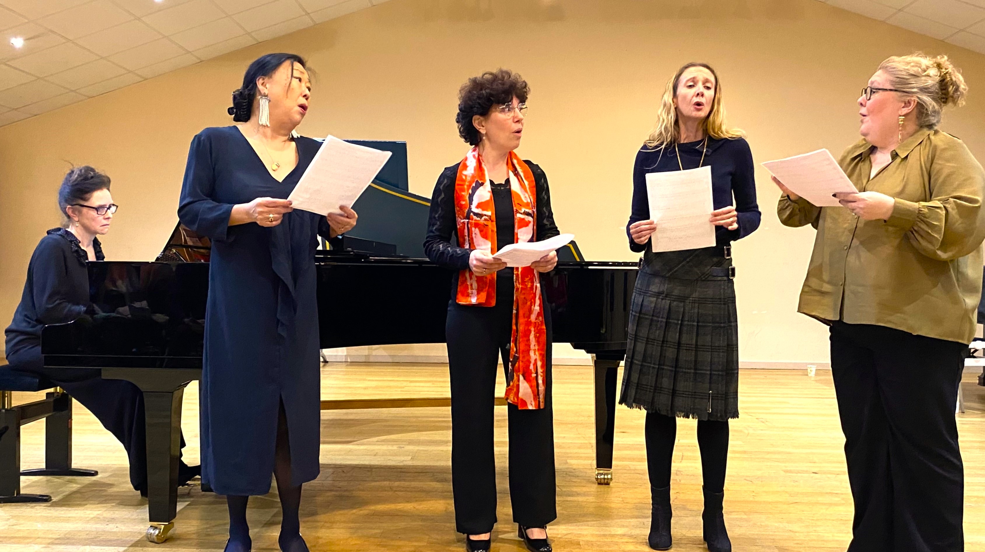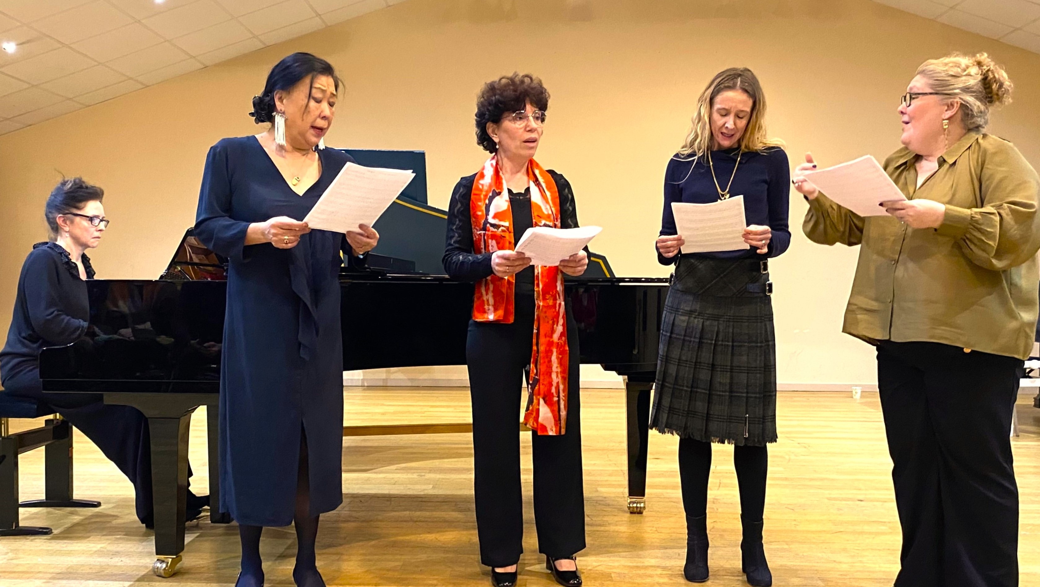 Nous avons découvert les jolies voix des nouvelles élèves de Catherine (à droite sur la photo ci-dessous) : Michelina et Mayena (centre droit), en solistes accompagnées par Anne, ou intégrées au quatuor avec Mika, que nous connaissons bien. Ces dames, en conclusion de notre concert, nous ont fait le cadeau de cette très jolie et très mélodieuse chanson napolitaine Dormite O pupille de Pietro Andrea Ziani, compositeur italien du XVIIe siècle.